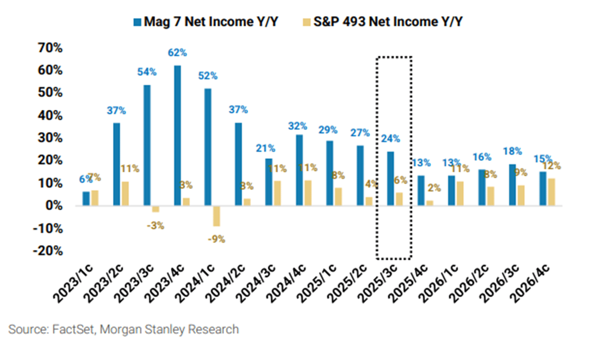 Below: Mag 7 is expected to see stronger earnings growth than the 493 over the coming quarters.