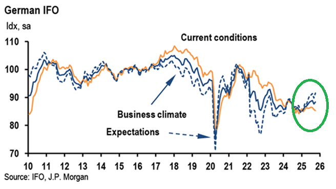 Latest IFO readings suggest German growth is running at 1.7%ar at the start of 4Q25. In fact, the details of today’s increase lend further support to the PMI’s signal that growth in Germany may be starting to accelerate.