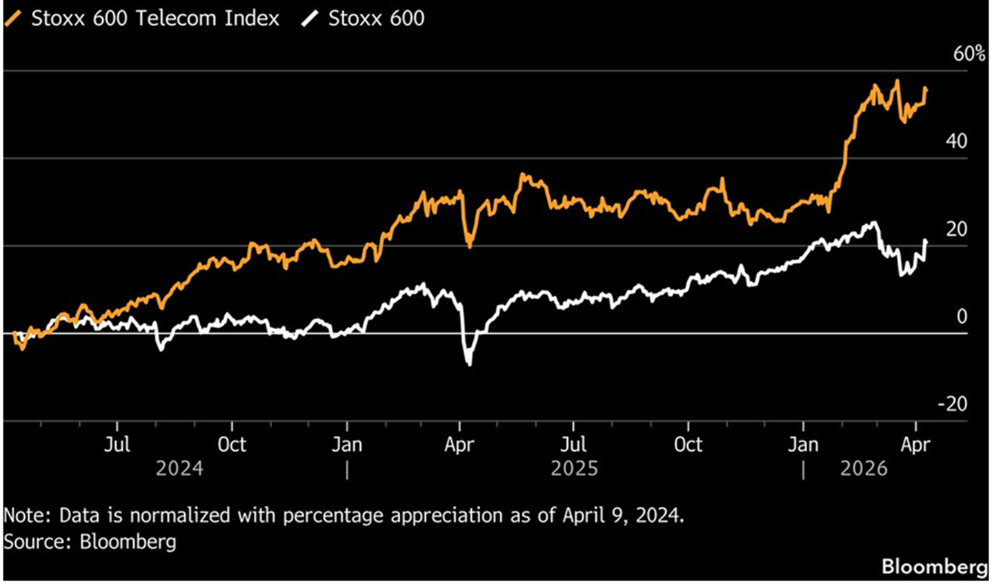 The Stoxx 600 Telecom Index is up 56% over the past two years, well ahead of the Stoxx 600ās 21% advance.