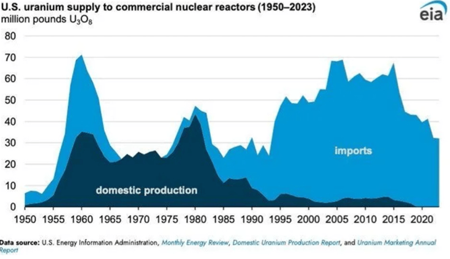 Nuclear is the only sector Trump hasn’t pumped yet. US domestic uranium production was strong until 1980, then collapsed. Today, US nuclear generators depend on imported uranium — mostly from unfriendly nations.