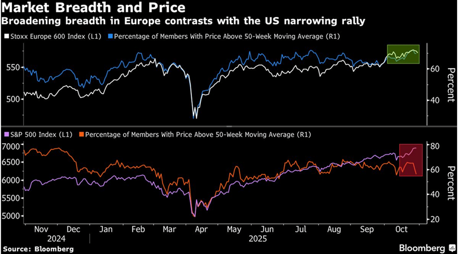 In contrast with a US market increasingly reliant on tech, Europe’s rally is broadening. Sectoral rotation is at full throttle, especially given how severe the polarization between well-owned European domestics and shunned exporters was after the summer. Now, exporters are staging a rapid recovery as this earnings season shows a milder impact from tariffs than most feared.