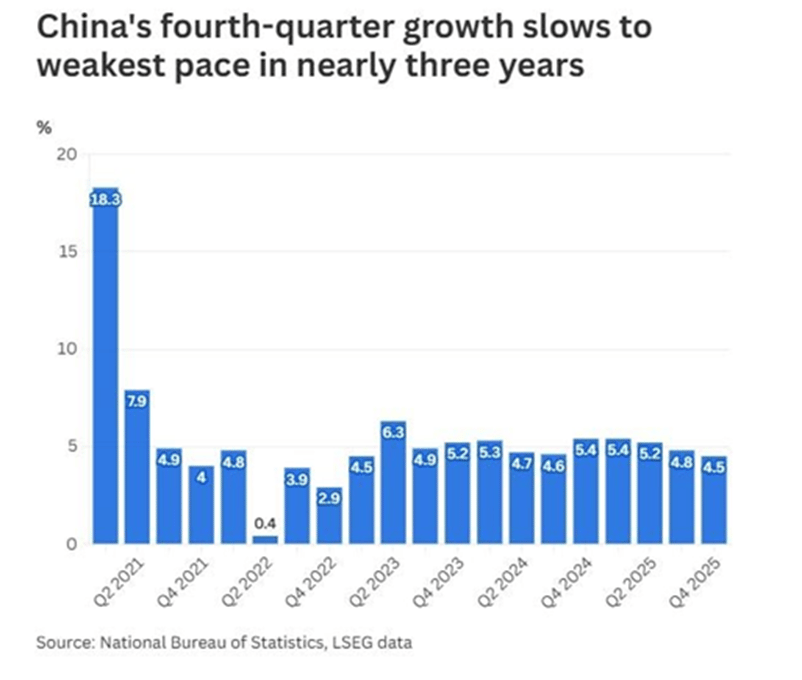 4. Chinaâs GDP grew 4.5%, the weakest in nearly three years.