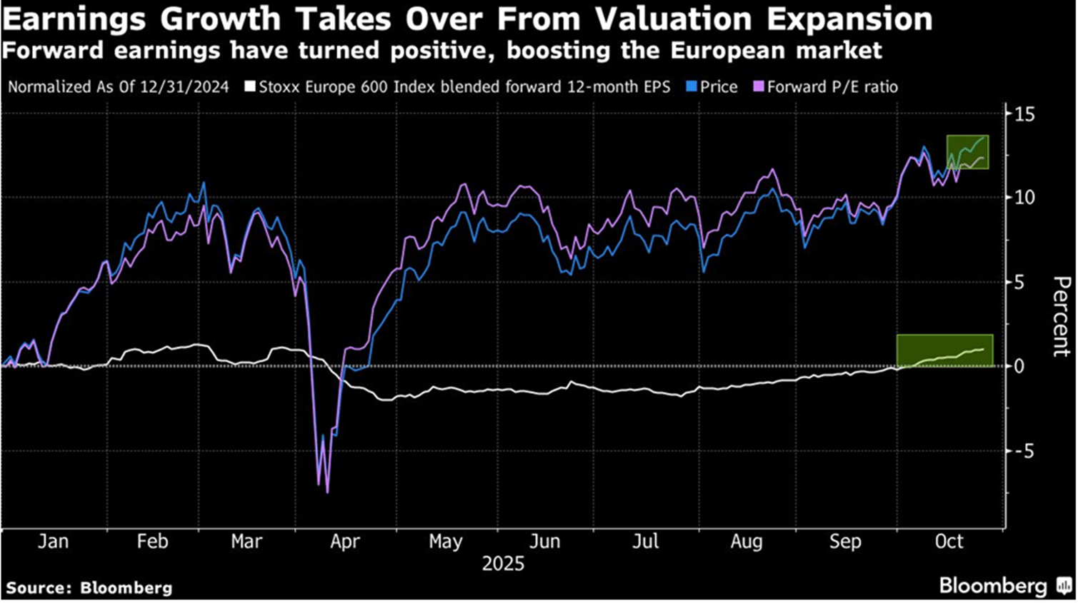 The Stoxx Europe 600’s 14% advance this year has been largely driven by valuation expansion. That’s changed a little in October, with the forward P/E ratio stabilizing around the 15 handle.