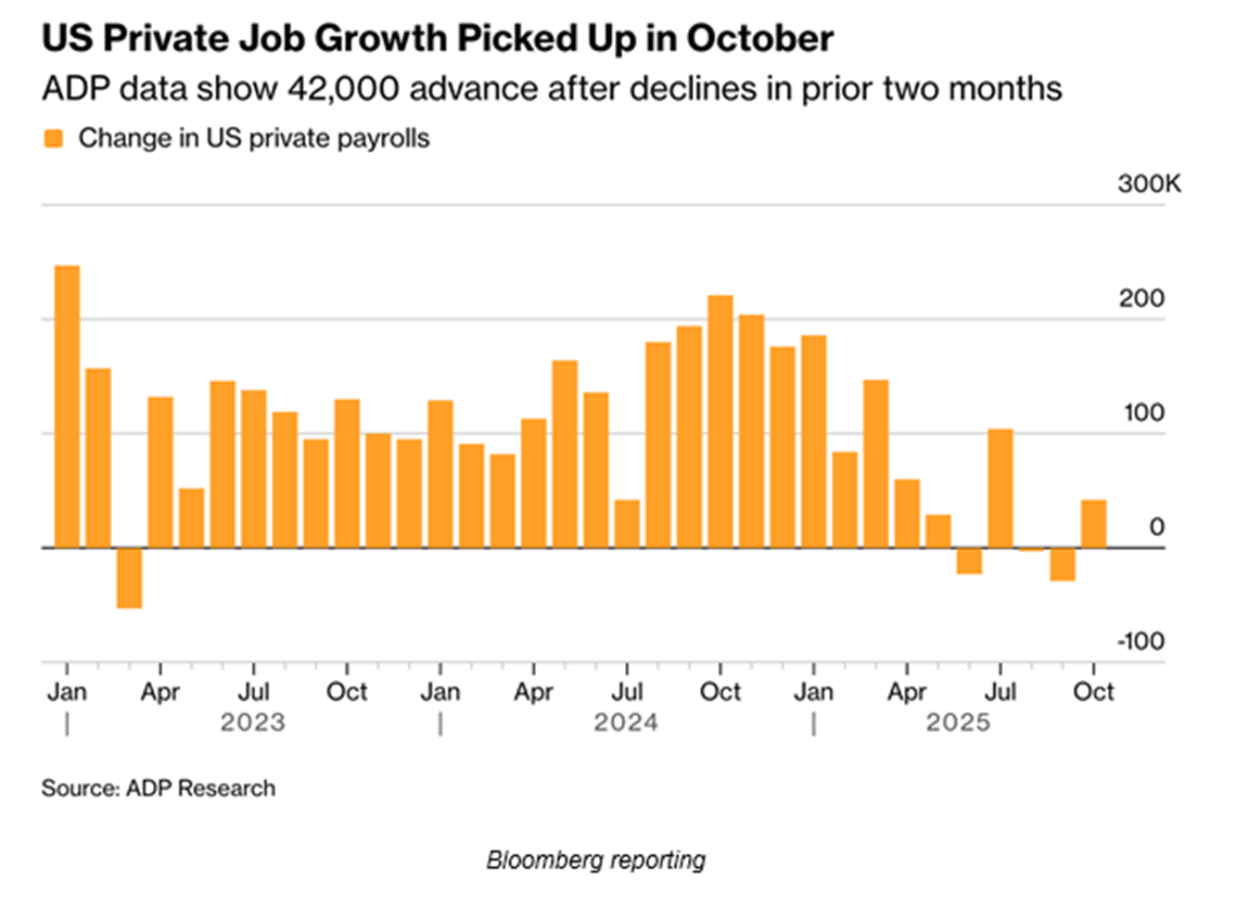 ADP data shows U.S. companies added 42,000 jobs in October, a breath of fresh air for one of the only data points investors have while the government remains closed for business. ADP is the largest private employer data collector, a huge human resources firm that collects data on 26 million employees across the U.S.