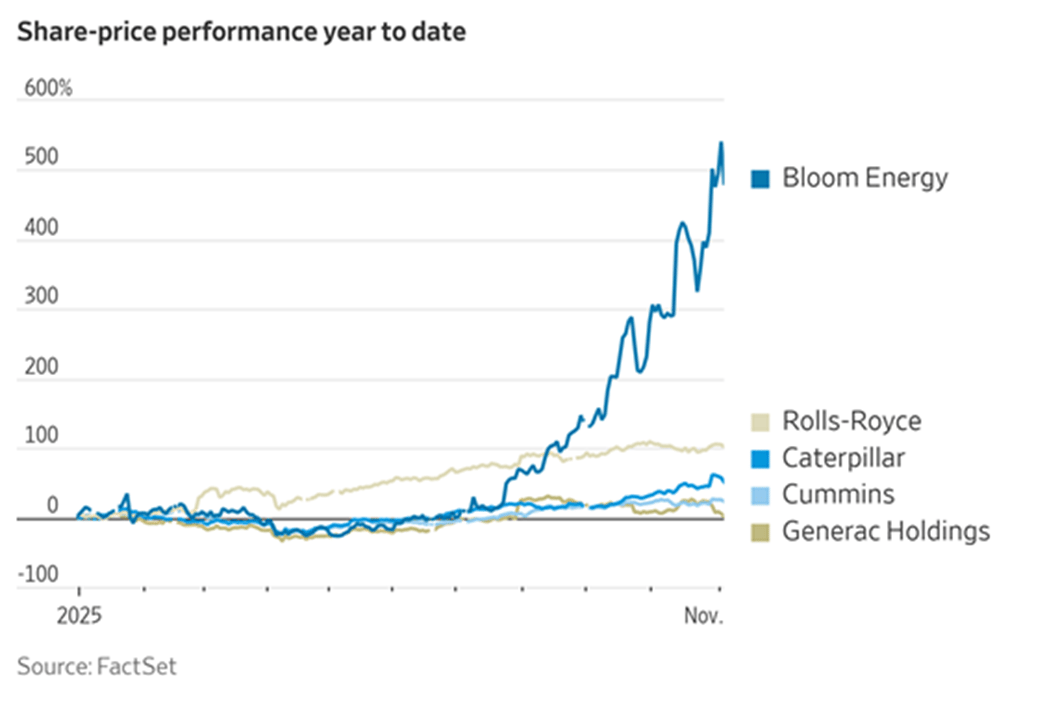 Data centers have thus turned to more expensive off-grid solutions that are nevertheless more readily available. These include Bloom Energy’s solid-oxide fuel cells, which use natural gas as fuel. Data centers are also using smaller natural-gas turbines and reciprocating engines—the piston-and-cylinder type that cars use—from companies like Caterpillar, Wartsila, Cummins, Rolls-Royce and Generac.