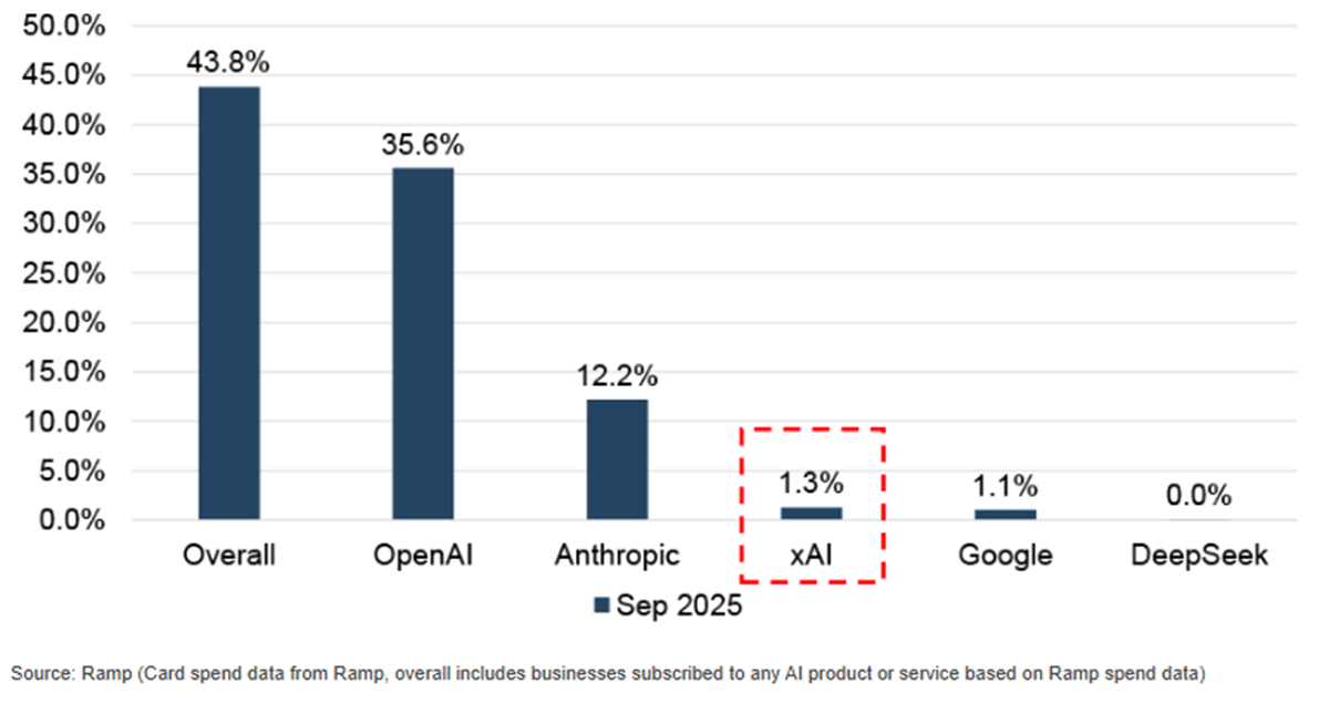 Below: Share of U.S. businesses with paid subscriptions to AI models, platforms, and tools (Sep 2025)