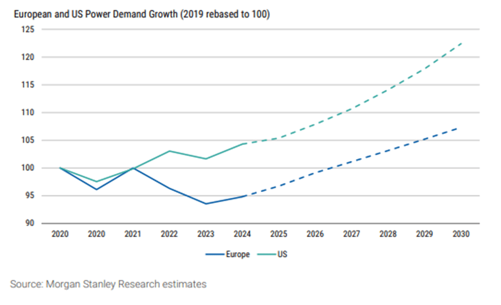 Below: Forecasts for rising total power demand in the US and Europe.