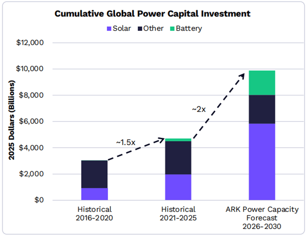 ARK Invest forecasts capital expenditure in power-generation must scale ~2× to ~$10 trillion by 2030 to meet global electricity demand.