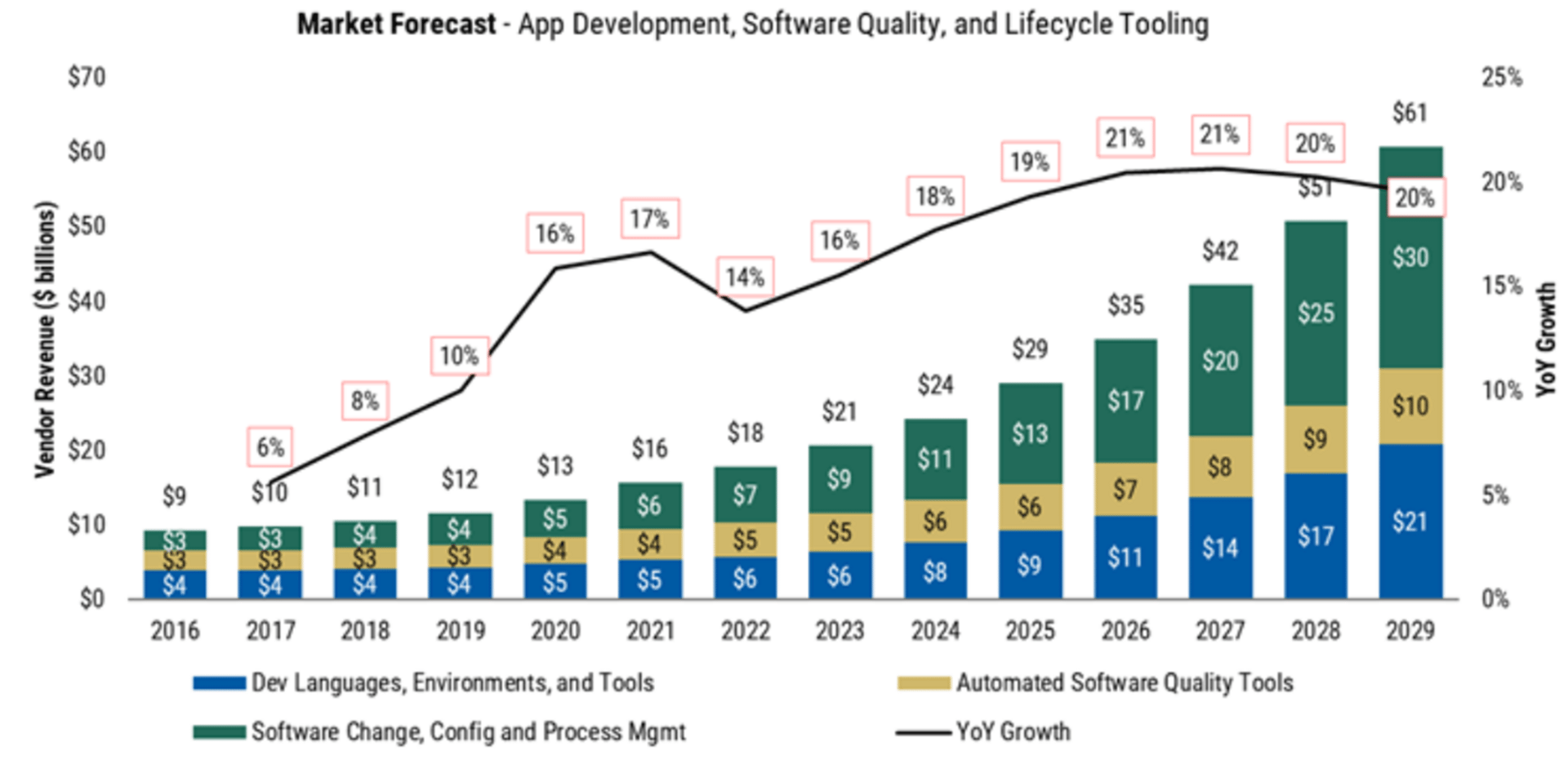 Below: Software development market is expected to grow at a 20% CAGR to reach $61 Billion by 2029.