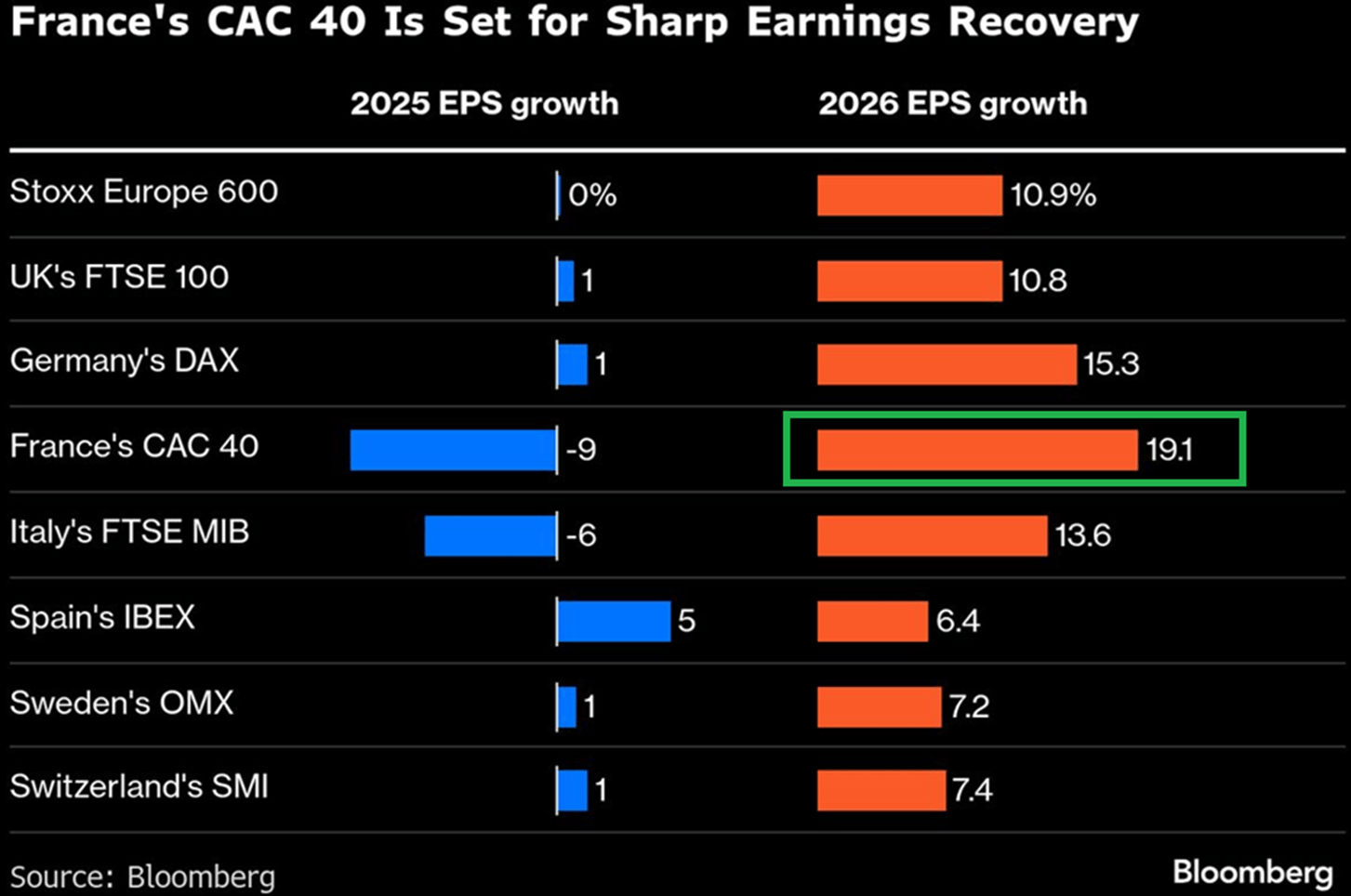 Meanwhile, earnings growth for industrials – a group that makes up 30% of the index and includes defense-exposed names Thales and Airbus, as well as data center infrastructure providers Schneider Electric and Legrand – is expected to reach 16.2% in 2026, after a tepid gain of 2.1% in 2025.
