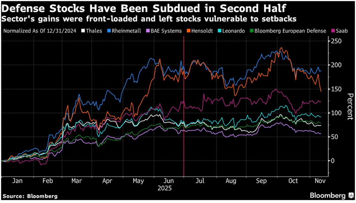 “There has been an understandable pullback in defense stocks given they have surged while it takes time for government spending to hit their order book,” says Delphine Arnaud, a portfolio manager at Edmond de Rothschild. “So it’s normal to see some profit taking from time to time.” NATO has set a target for military outlays to reach 3.5% of GDP by 2035 and Germany is well ahead, planning to increase annual defense spending to more than €160 billion by 2029. Arnaud says investors should position for a boost to earnings arriving in the second half of 2026. “This is the right moment to get back into European defense,” she says.