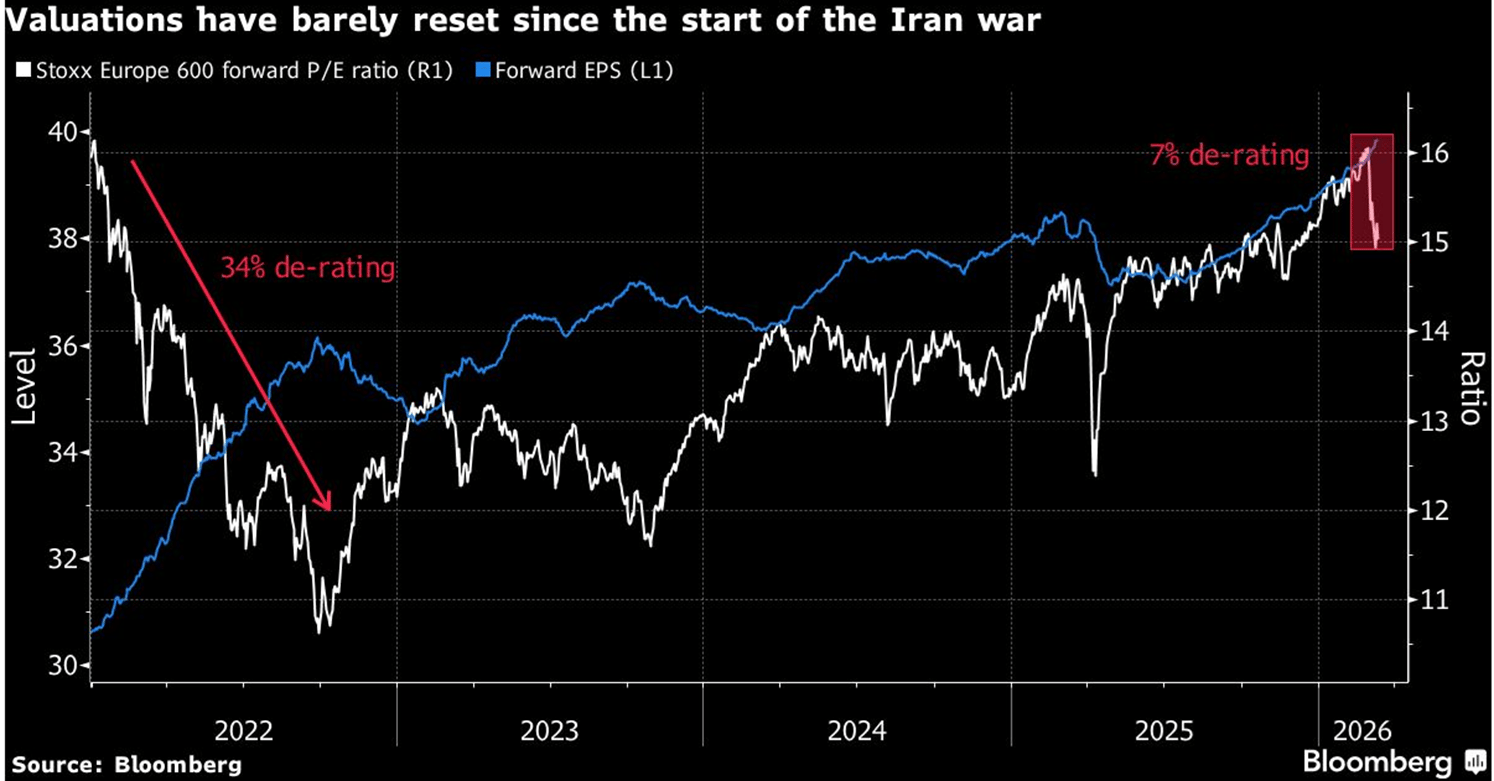 Back in 2022, the European market suffered a 34% valuation de-rating as the Ukraine war delivered an energy shock. This time around, the pullback has been just 7%.