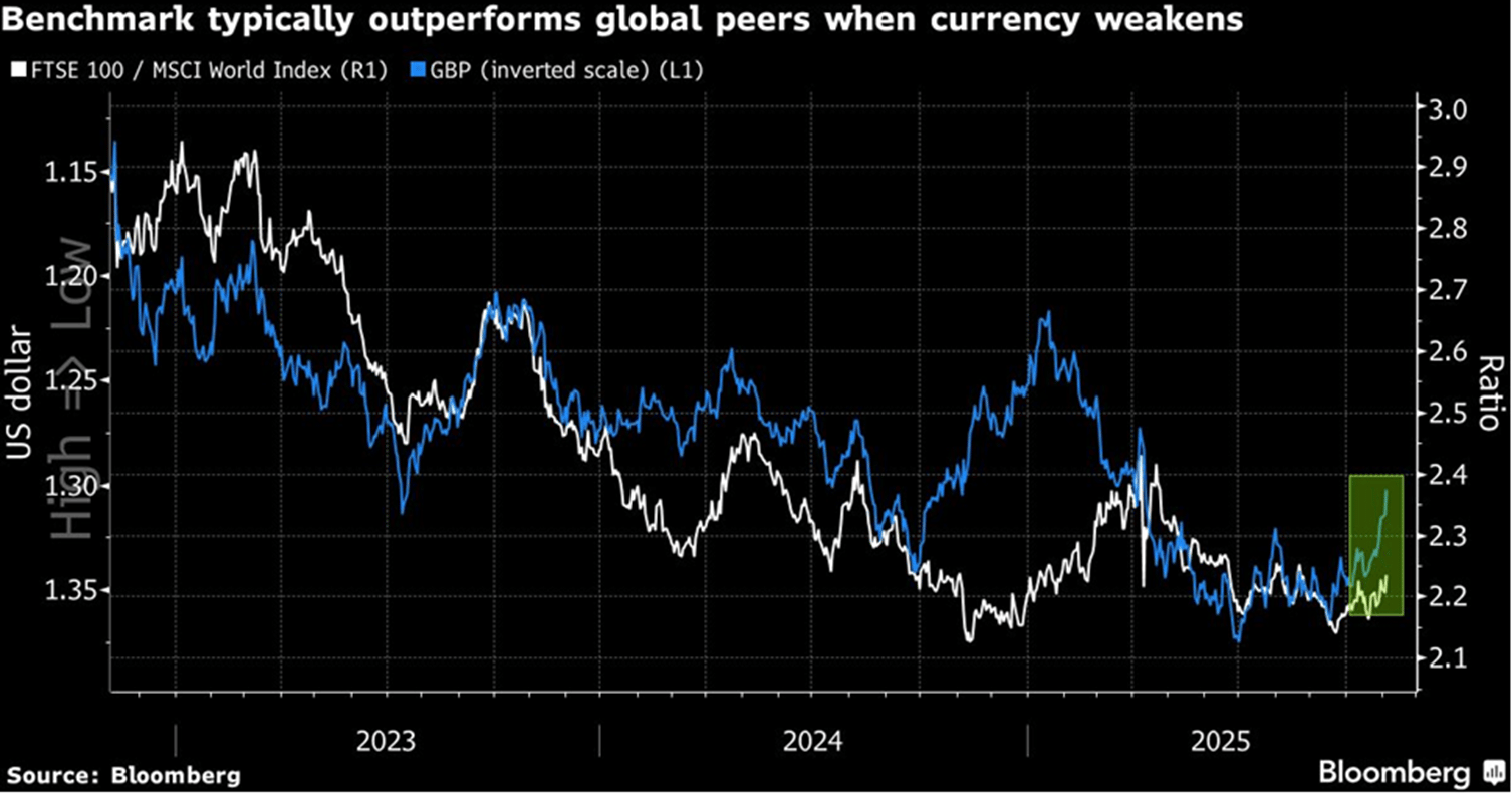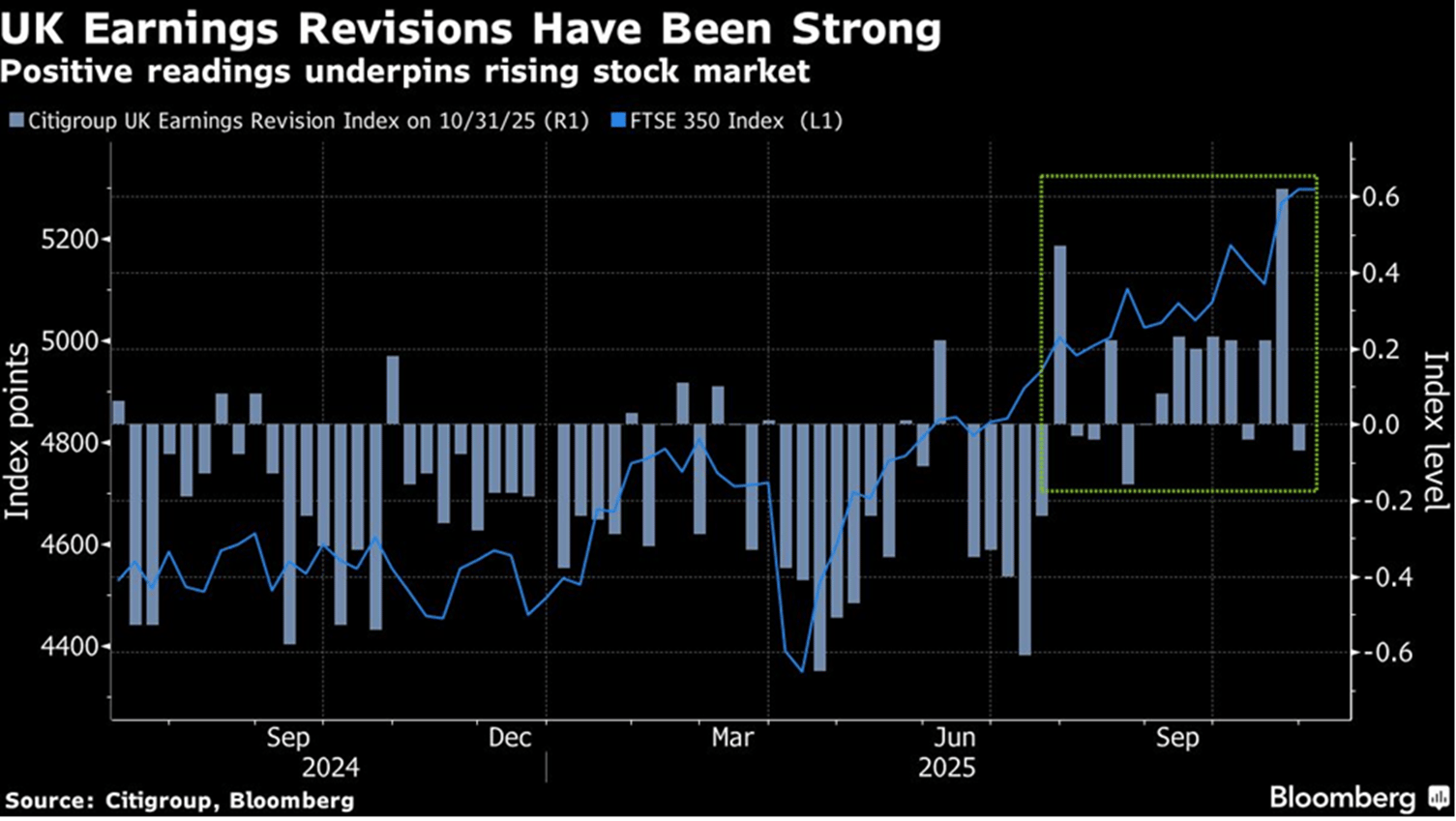 Expectations of tighter fiscal policy and a more dovish BOE have weakened the pound. The British currency is down 5.3% against the dollar since a peak in July. That’s mechanically helping the FTSE 100, whose members generate 75% of their revenue outside the UK. A considerable amount of bad news is priced into UK shares and there is scope for them to move higher once the budget is out of the way and clarity improves.