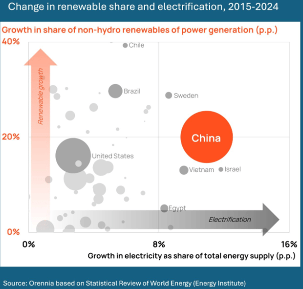 Over the past decade, China has increased the share of electricity in its total energy consumption by around 10% - more than almost any other country. Its rapid growth in clean power, especially renewables, is unparalleled. No nation has invested more or built faster in this space.