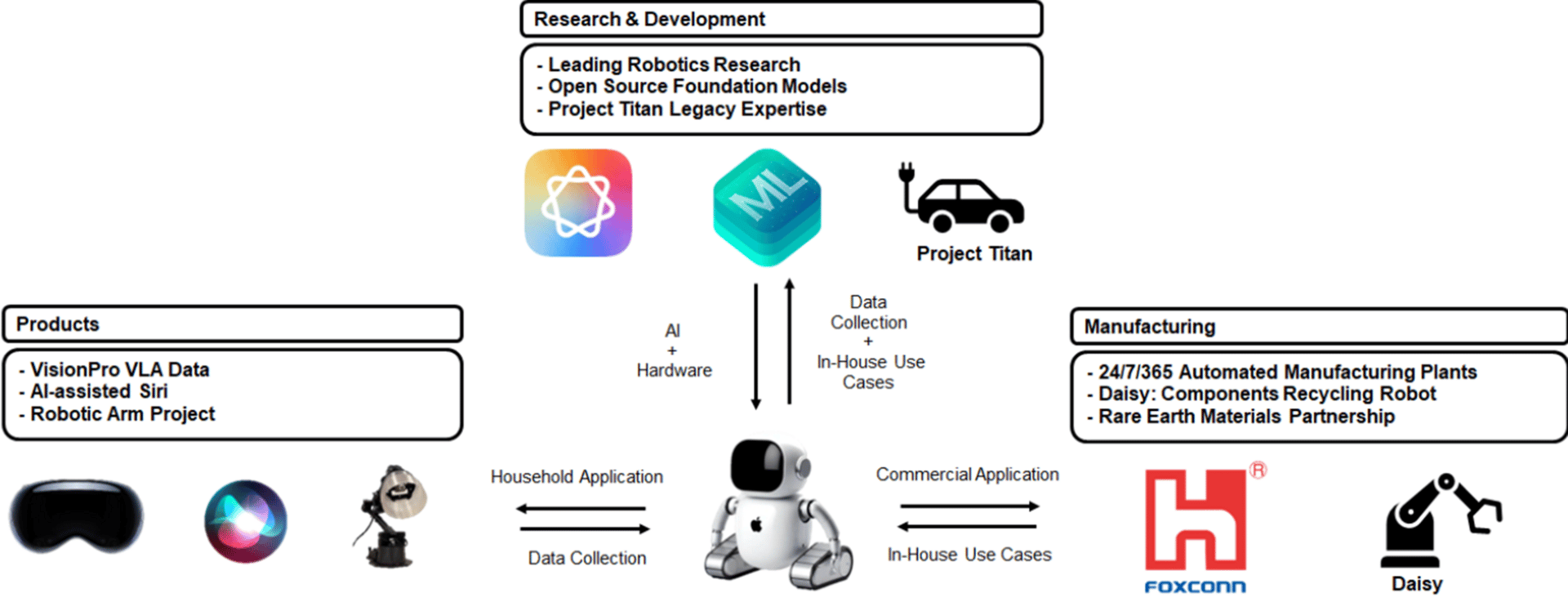 Apple's expertise in vertically integrating hardware, software, services and semiconductors, its learnings from manufacturing at scale for several decades, and its ability to collect and harness vast amounts of differentiated visual data across 2.3bn devices and over 1.4bn iPhones serves as the basis for its Robotics efforts. Yet in addition, Apple is investing in rare earth minerals, accelerating machine learning hiring, ramping robotics patent activity/research, and reportedly collaborating with leading physical AI companies (BYD) to accelerate its robotics efforts. With control over hardware, software and data, and the expertise in solving early robotics use cases within its own supply chain (Daisy), Apple is uniquely positioned to help lead the next wave of intelligent machines.