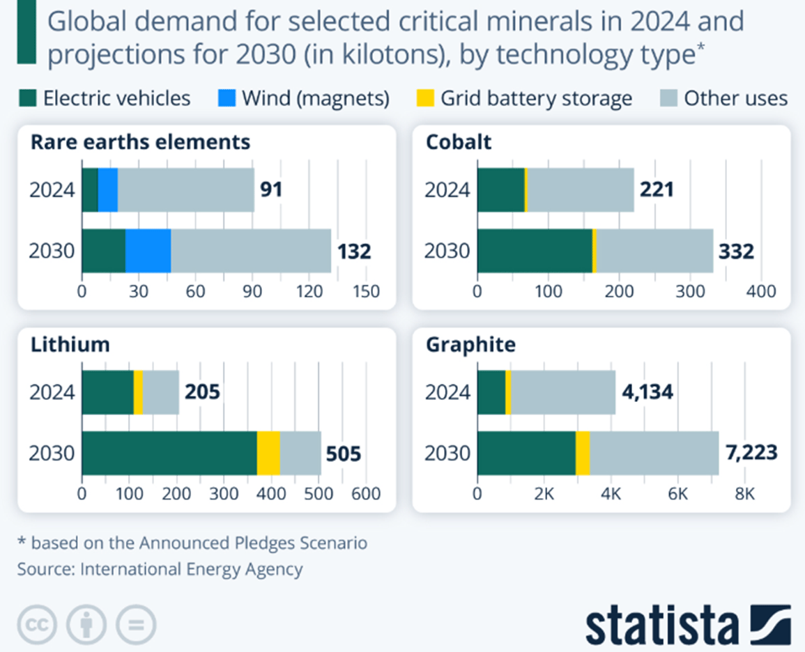 By 2030, the International Energy Agency (IEA) projects that global demand for minerals like rare earths, cobalt, graphite and lithium could double or even triple (depending on different scenarios), driven by the rise of electric vehicles, renewable energy infrastructure and advanced electronics (AI). These minerals represent the backbone of modern industries - and geopolitical competition - while China currently controls the large majority of their supply chain.
