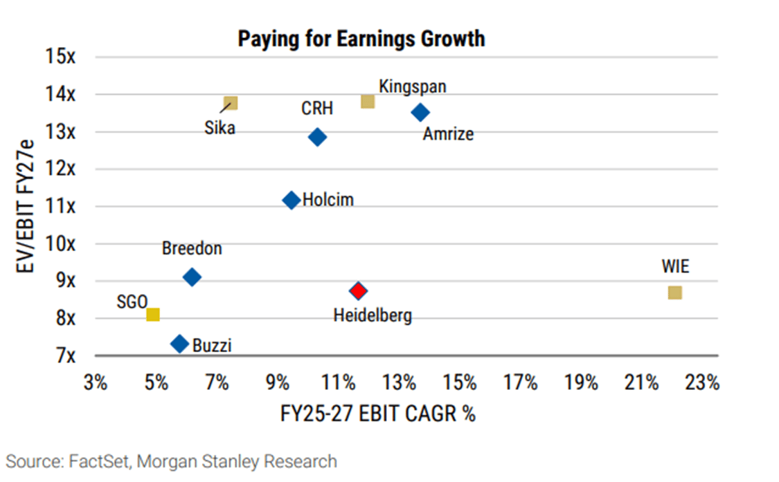 Below: On consensus earnings growth, Heidelberg trades inexpensive vs peers.