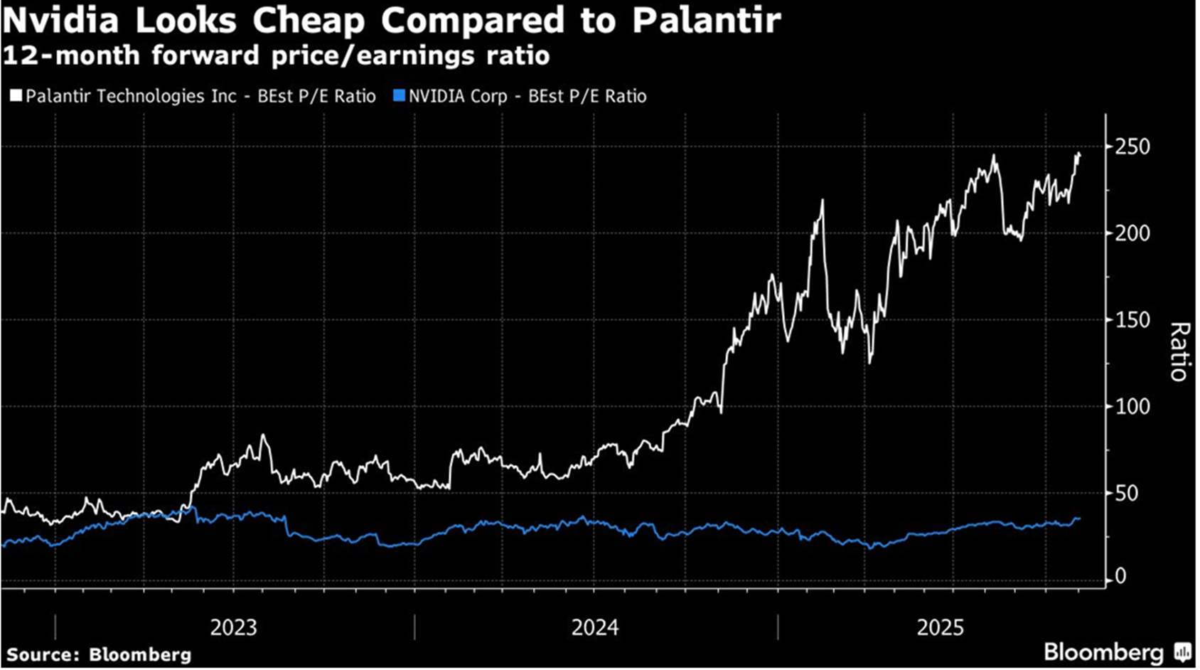 Below: Palantir trades at nearly 250 times its 12-month forward earnings estimates, compared with AI chip frontrunner Nvidia's 33.