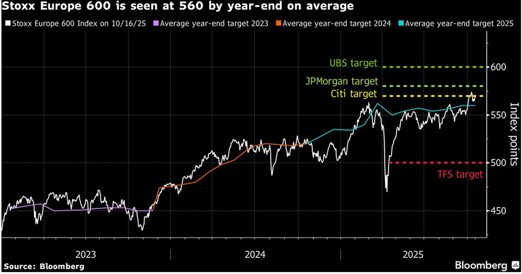 JPMorgan strategist Mislav Matejka upgraded euro-zone stocks earlier this month. While he left his year-end target unchanged at 580 â implying gains of about 2% more â he said he was âhappy to take advantageâ of sideways trading in regional stocks. âWe are more optimistic on 2026 as some fiscal stimulus and still-accommodative monetary policy may support European equity indexes.â