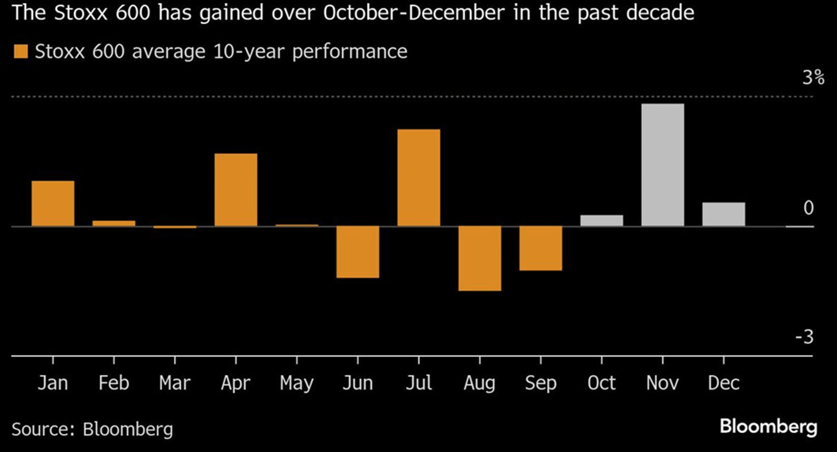 Data compiled by Bloomberg show the Stoxx 600 has gained an average 3.6% in the final three months of the year, its strongest quarterly performance over the past decade.